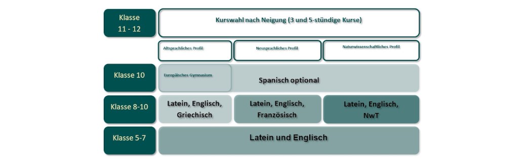 Als dritte Fremdsprache kommt entweder Französisch oder Altgriechisch in Klasse 8 hinzu, wenn das sprachliche Profil gewählt wird..