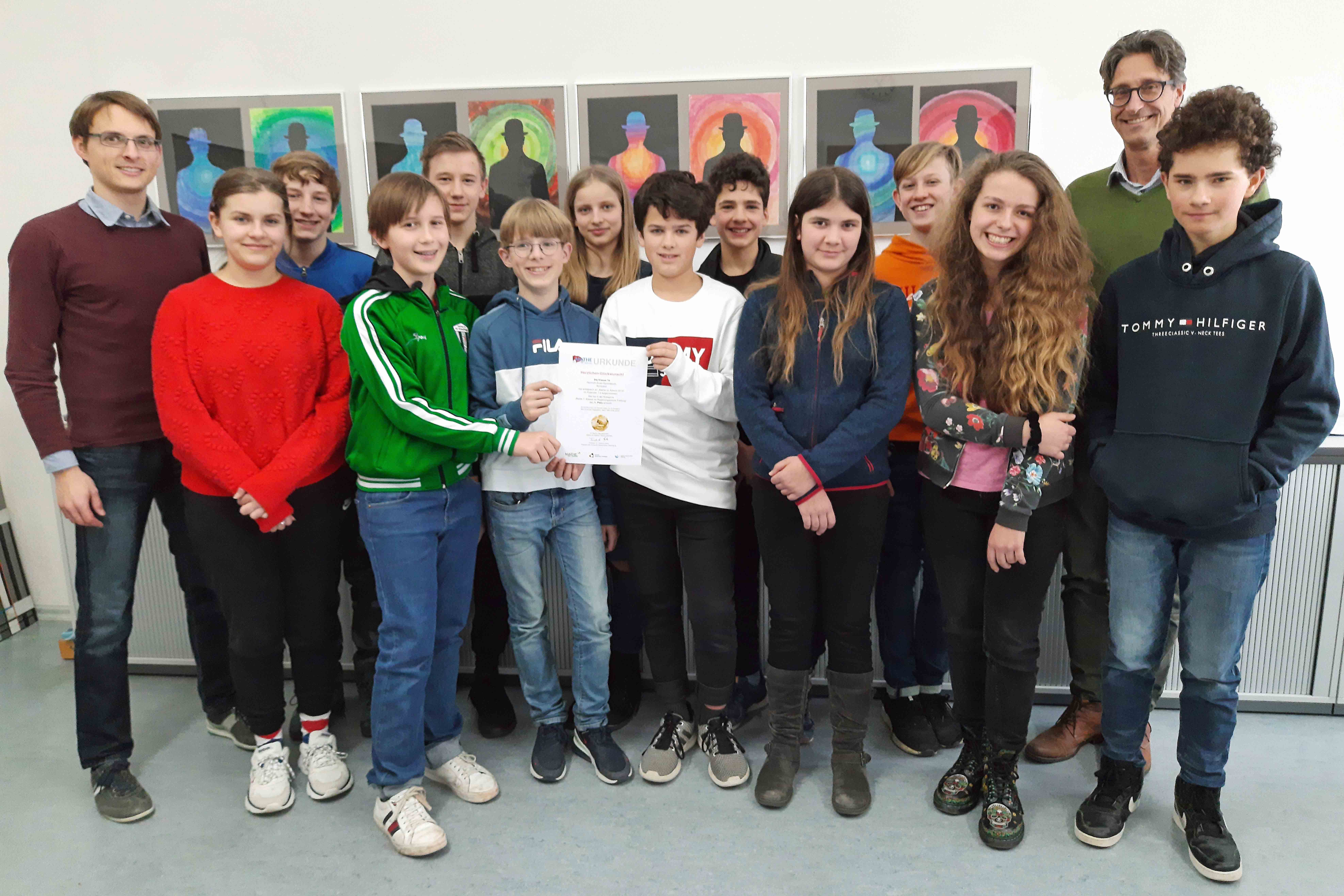 Dieser Team-Erfolg wurde nun in einem feierlichen Rahmen in Waldkirch bei Freiburg ausgezeichnet. Stellvertretend für die gesamte Klasse nahmen Jolina Huber, Christof Bartels, Maxim Harder, Karl Jüngling und deren Mathelehrer David Jansen eine Urkunde sowie ein Preisgeld in Höhe von 200 Euro entgegen. Stolz kehrten sie wieder nach Konstanz zurück. Dort wurde die gesamte Klasse von Schulleiter Patrick Hartleitner für diese Team-Leistung beglückwünscht.
